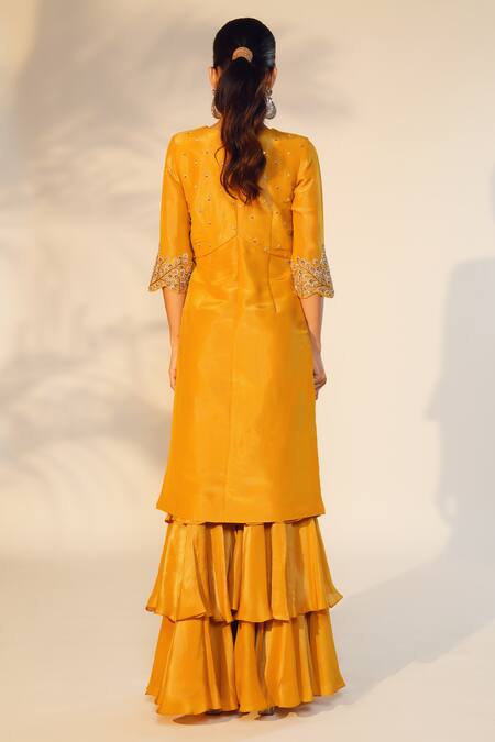 Mustard yellow kurta featuring a V neck, three quarter sleeves, and hand embroidered yoke with beads and cutdana. Paired with a ruffled sharara with an elasticated waistband and attached lining.