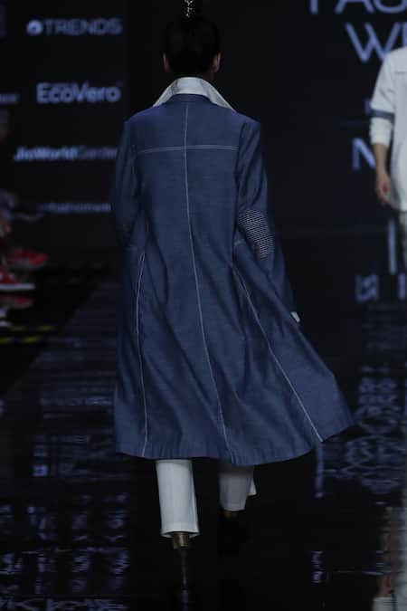 Indigo blue long jacket with striped panel paired with button-front white shirt. Comes with plain pants.