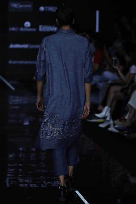 Blue straight kurta with front flap pockets & placement leaf motif work. Comes with plain pants.