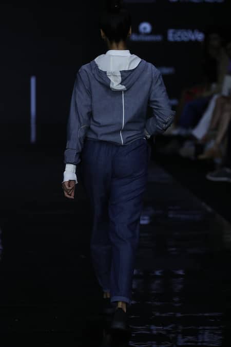 Indigo blue jacket with placement leaf motif detail. Comes with white inner top & pants.