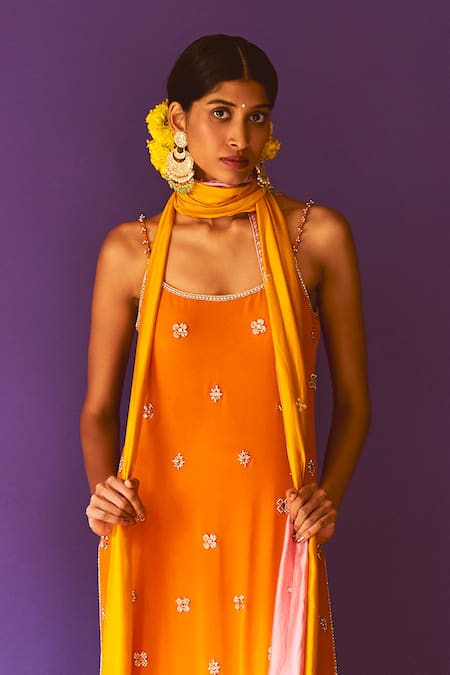 Amber kurta featuring hand embroidery with a straight silhouette. Paired with a coordinating churidar and dupatta.