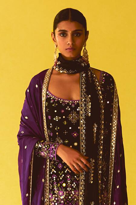 Black and purple kurta set featuring hand embroidery with an attached lining. Paired with a matching sharara and dupatta adorned with intricate embellishments.