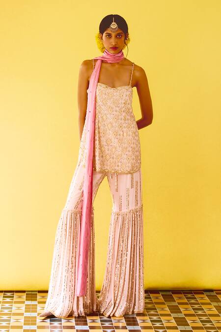 Blush pink kurta featuring hand embroidery and padded design. Paired with a sharara and an attached jacket.