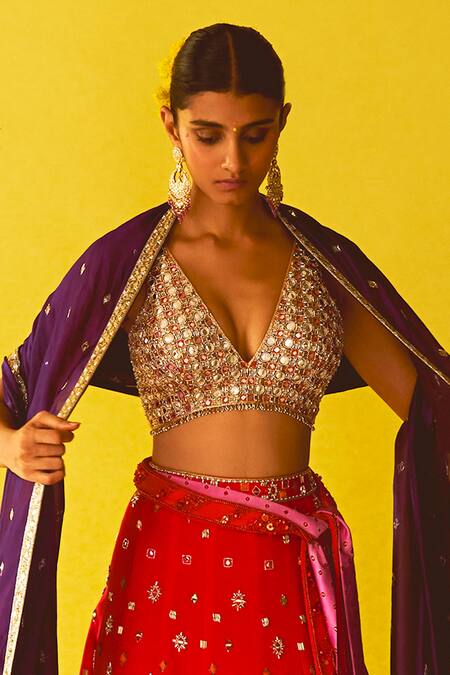 Gold Silk, Crepe, Organza Sequins, Embroidery Burnt Orange And Purple Lehenga Set