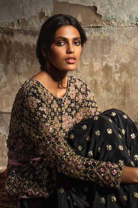 Black kurta featuring all over floral jaal embroidery with tonal sequins and beads. Paired with a flared gharara adorned with embellished floret motifs.