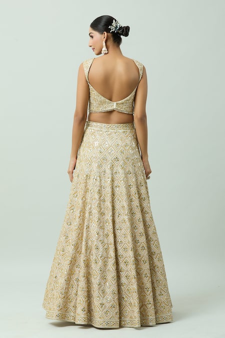 Beige Silk, Crepe, Organza Gota Patti, Embellished Geometric Bridal Lehenga Set