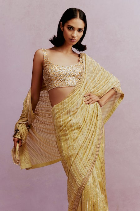 Beaded and cutdana hand embellishments on saree, Abstract work on blouse