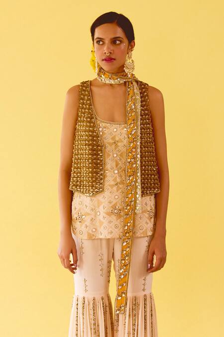 Mustard and beige kurta featuring hand embroidery, paired with a matching sharara and a jacket. The ensemble is crafted from silk crepe with an attached inner lining.