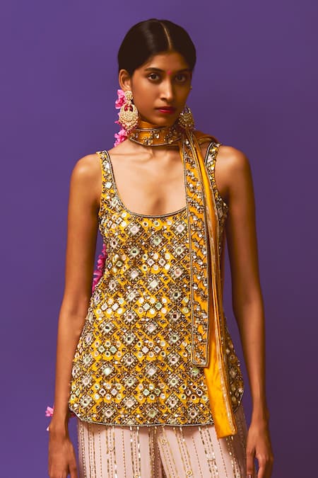 Mustard kurta featuring hand embroidery with a scoop neckline. Paired with lilac silk crepe pants that have intricate embellishments.