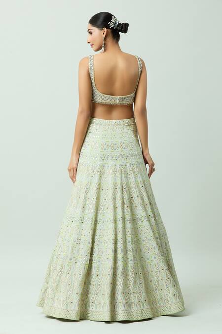 Mint green lehenga featuring thread embroidered mirror embellished geometric motifs. Comes with a sequin embellished padded blouse and dupatta.