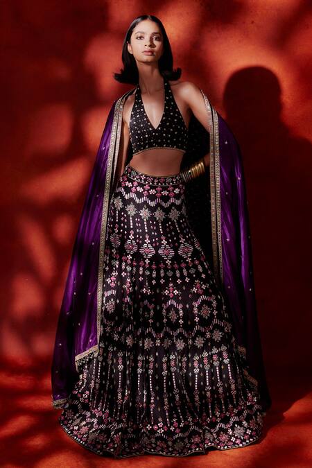 Black lehenga featuring all-over tribal hand embroidery and a cancan. Paired with a padded blouse adorned with embroidered buttis and a contrasting purple dupatta.