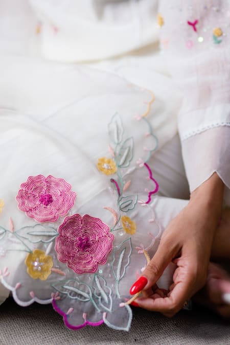 Off-white kurta with multicolor bead, sequin, pearl & french knot embroidery. Paired with pant & dupatta.