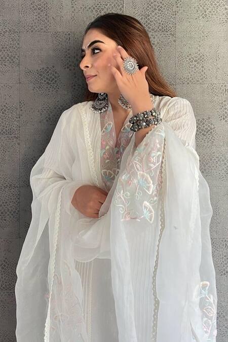 Off-white kurta with pintuck, lace detailing & floral embroidered neckline. Paired with pant & dupatta.