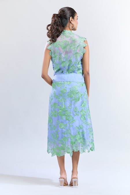 Light blue organza wrap jacket dress featuring sea green floral aari embroidery. Accompanied by an inner slip and a tie-up belt.