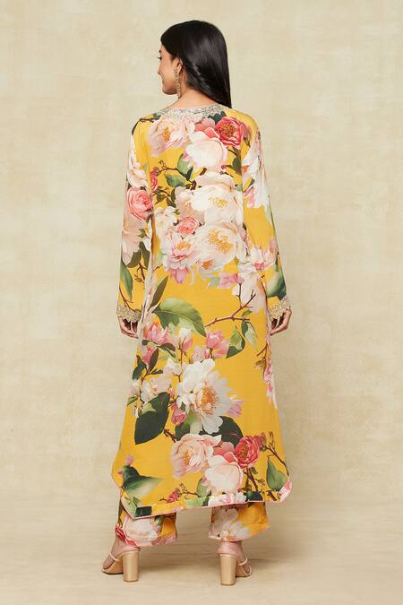 Yellow kurta featuring all-over floral prints with an embroidered yoke and sleeve hem. Paired with coordinating printed pants, this set is designed for comfort and style.