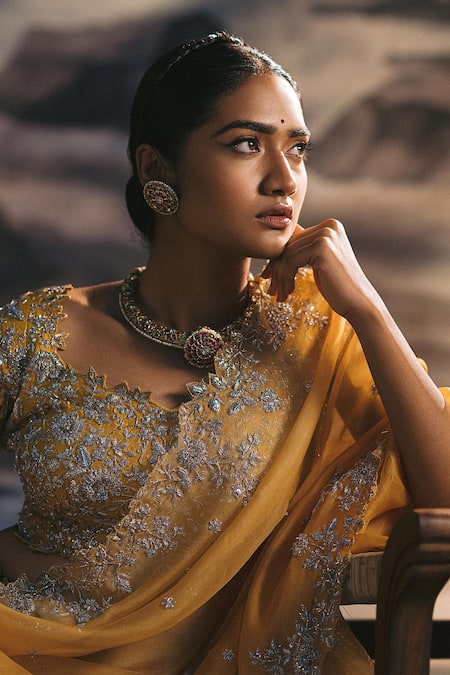 Mustard yellow lehenga with all-over zardozi embroidery and cutwork hemline. Comes with blouse and dupatta.