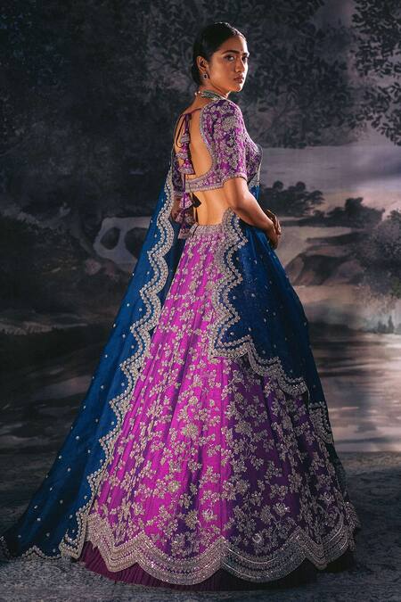Purple lehenga with all-over cutdana, sequin and thread embroidery. Comes with blouse and dupatta.
