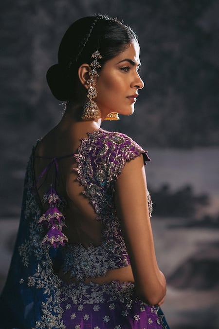 Purple lehenga with all-over zardozi embroidery and cutwork hemline. Comes with blouse and dupatta.