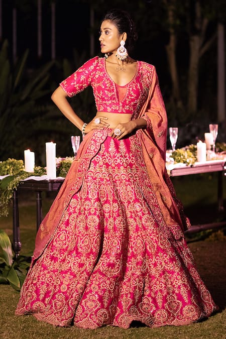 Rani attached cancan lehenga on pure raw silk base with peach resham, zardozi & pearl embroidery. Comes with embroidered & padded blouse & tissue dupatta.
