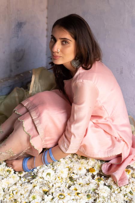 Powder pink chanderi embroidered kurta. Paired with embroidered pant and dupatta.