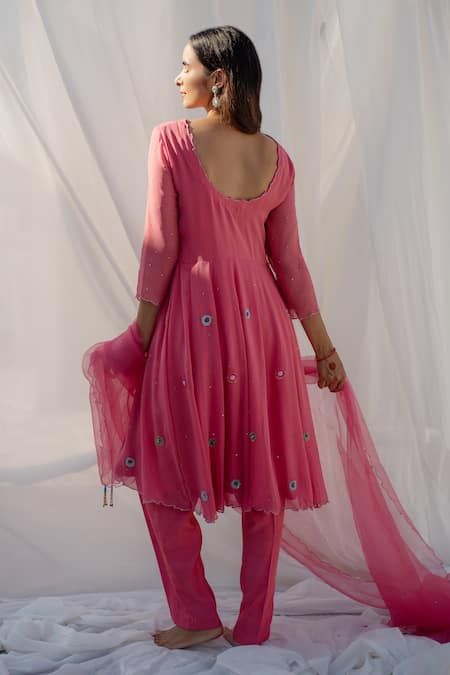 Strawberry pink floral embroidered anarkali. Paired with solid pant and dupatta.