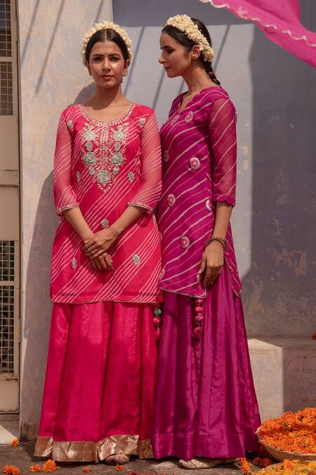 Buy_Apeksha Jain Label_Pink Silk, Organza, Georgette Gota Work, Floral Embroidered Kurta Lehenga Set_at_Aza_Fashions