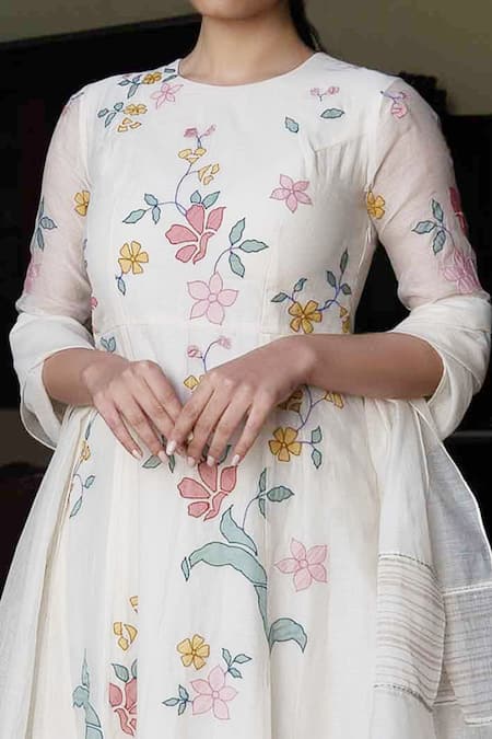 White Muslin Cotton Floral Motifs Crew Applique Anarkali With Printed Dupatta