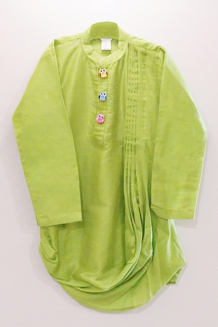 Green kurta featuring pleated cowl drape and front buttons. Paired with matching pant.