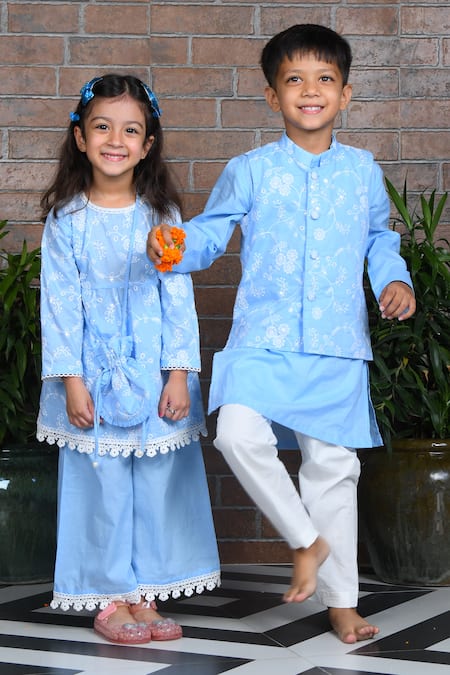Buy_APRICOTKIDS_Blue Cotton Lace, Sequins, Embroidery Floral Anarkali Palazzo Set_at_Aza_Fashions