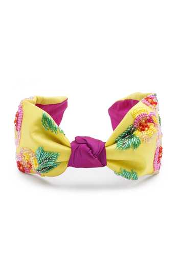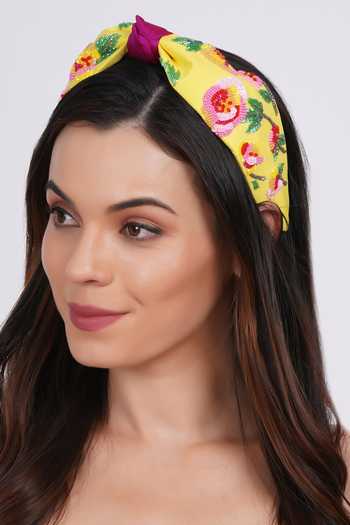 Yellow headband featuring cascading blossom beadwork, sequins and intricate embroidery. Paired with a secure anti-slip grip and one-size-fits-all comfortable design.
