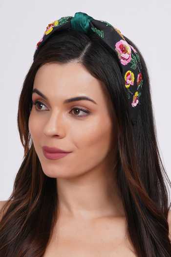 Black knotted headband featuring handcrafted beaded floral motifs, sequins and Japanese-style beads. Soft cotton fabric with a knotted center and anti-slip grip for comfortable one-size-fits-all wear.