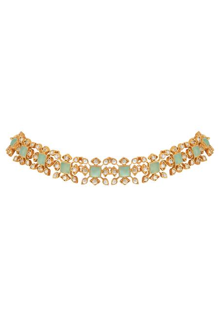 Aqua quartz in floral motifs elegantly crafted in gold plated silver, this necklace is perfect for that blush silk ensemble.
