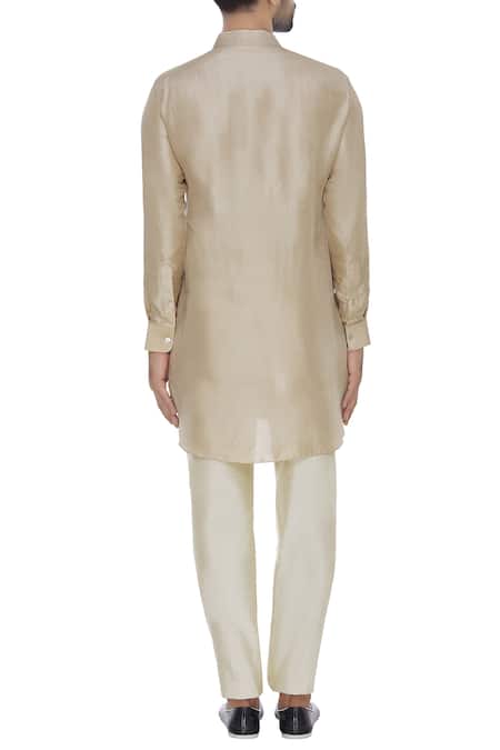 Achieve a polished look dressed in this dupion silk minimal beige kurta. Team up with straight silk pants for the complete look.
