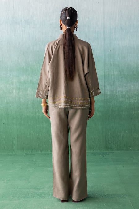 Brown shirt featuring wave embroidered patterns, kalamkari crane-floral applique, and sequin bead work. Paired with matching relaxed fit pants.