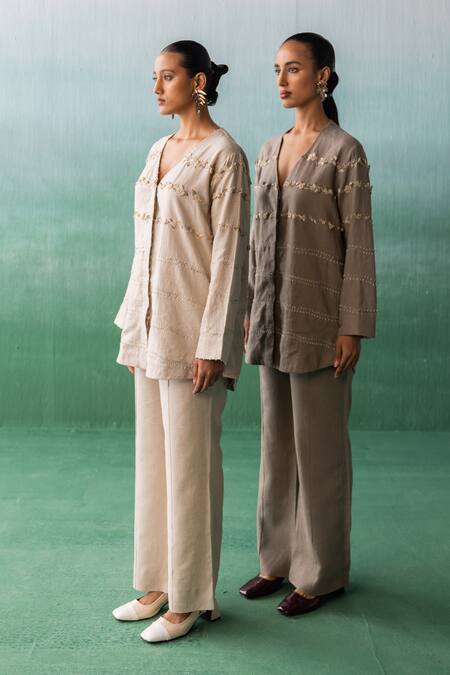 Beige Linen Embroidery, Applique, Beads V-neck Floral Beadwork Shirt With Pant