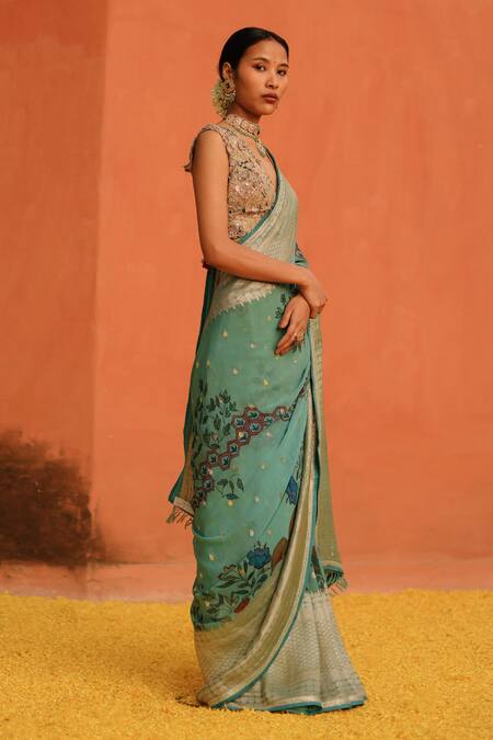 Aqua saree featuring all-over hand-painted kalamkari floral honeycomb motifs