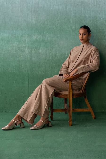 Brown shirt featuring wave thread embroidery and sequin bead work. Paired with matching relaxed fit pants.