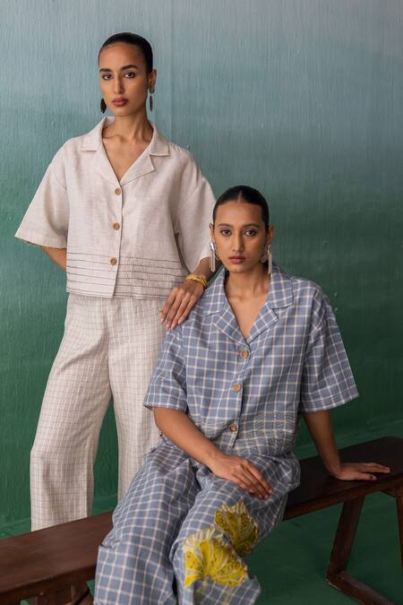Beige Linen Embroidery, Applique Threadwork Cropped Shirt With Checkered Pant