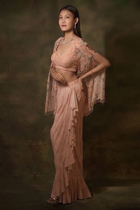 Pink embroidered dhoti set featuring a sleeveless blouse with Lucknowi work and sequin embellishments. Paired with a floral patterned open jacket with cape sleeves and frilled hem detail on the dhoti skirt.