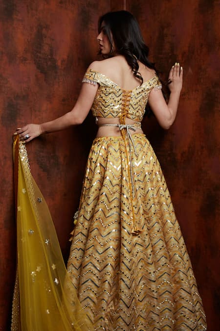 Yellow tie dye orange hue lehenga embroidered with leather & mirror work in chevron pattern. Paired with off shoulder blouse with tassel hem, sheer dupatta & embellished belt.