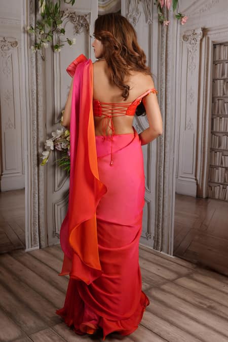 Red & pink ombre pre-stitched saree with waterfall cascading palla & 3D floral work. Comes with off shoulder contemporary blouse.