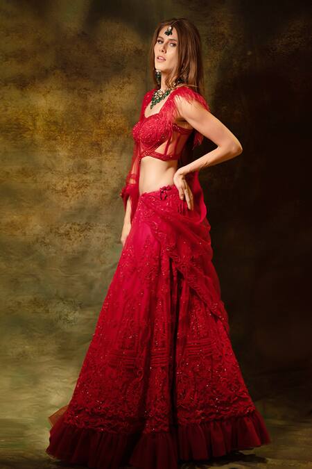 Red lehenga featuring intricate Swarovski and thread embroidery. Paired with a padded corset blouse and a dupatta.