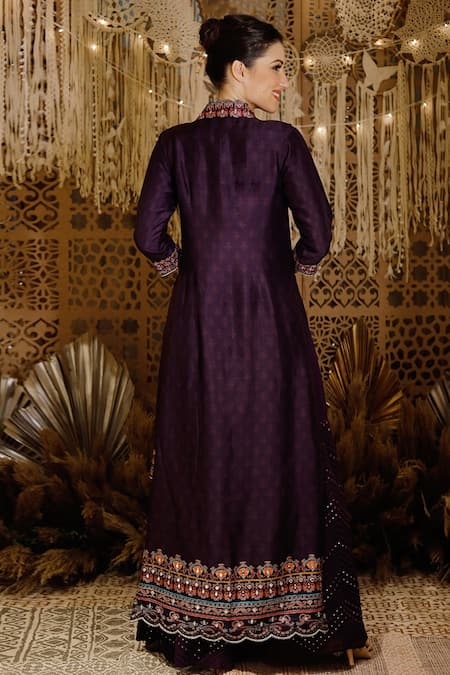 Purple jacket with floral print & embroidery. Paired with resham embroidered kurta & palazzo.