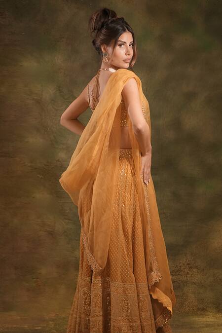 Yellow georgette lehenga featuring intricate thread, gota, mirror, and pearl embroidery. Paired with a padded blouse and a net dupatta.