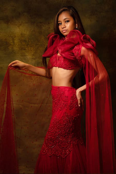 Red net lehenga featuring French lace and Swarovski stones embroidery. Paired with a padded blouse with ruffle structured sleeves and attached drapes.