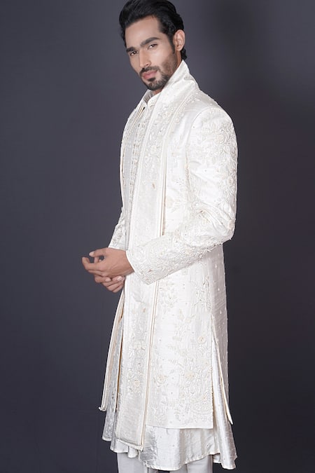 Ivory sherwani featuring intricate floral hand embroidery with sequins, cutdana, beads, and stones. Paired with anarkali kurta, dupatta, and pant.