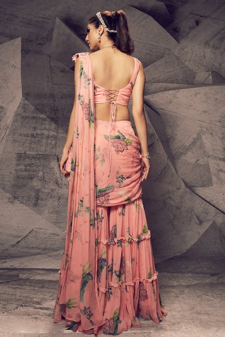 Pink sharara saree featuring floral sequins work and a front cutout blouse. Includes a padded blouse with mirror work and a tiered sharara design.