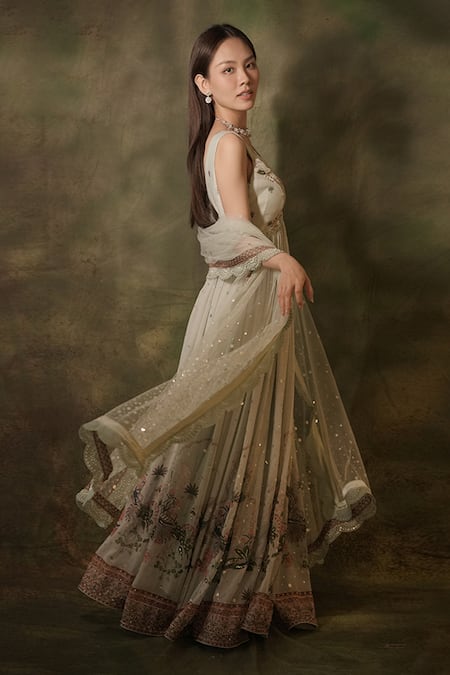 Green padded anarkali featuring floral and bird patterns with pearl embroidered borders. Accompanied by a sequin scatter embellished dupatta.