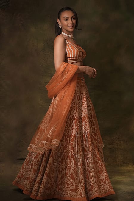 Rust raw silk lehenga featuring hand embroidery and an attached cancan. Paired with a padded blouse and a net dupatta.