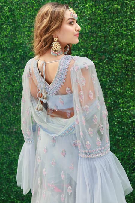 Blue sheer net kurta with baby pink embroidery in resham thread work, hand highlighted with cutdana, Swarovski stones & sequins. Paired with dupatta & raw silk sharara.